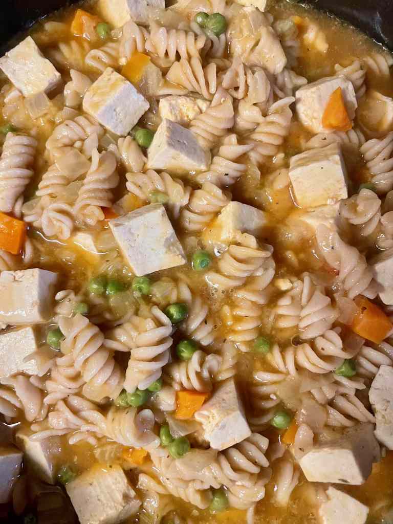 This is a new recipe that I added to my rotation. Once the weather starts to get a bit cooler and we head into fall, soups become a weekly staple. Please enjoy the vegan version of chicken noodle soup from our sick days home from school.